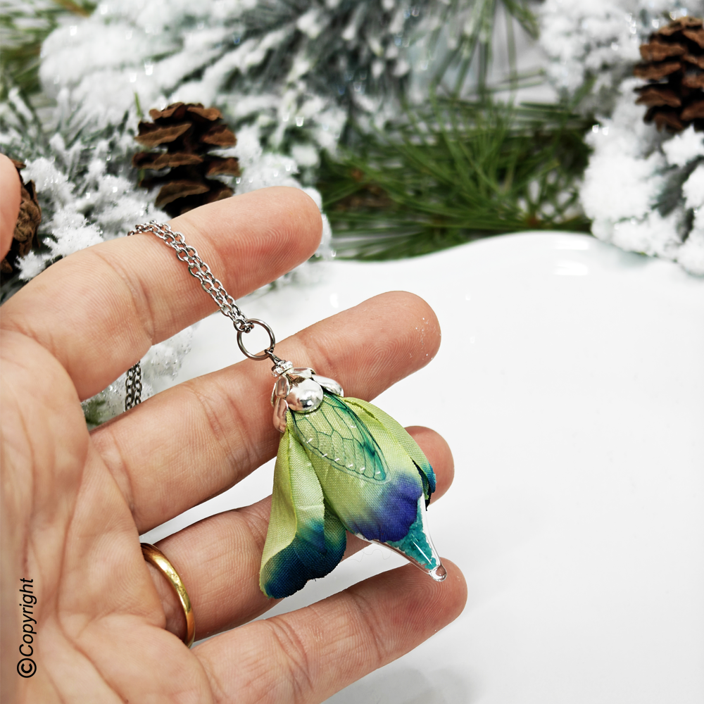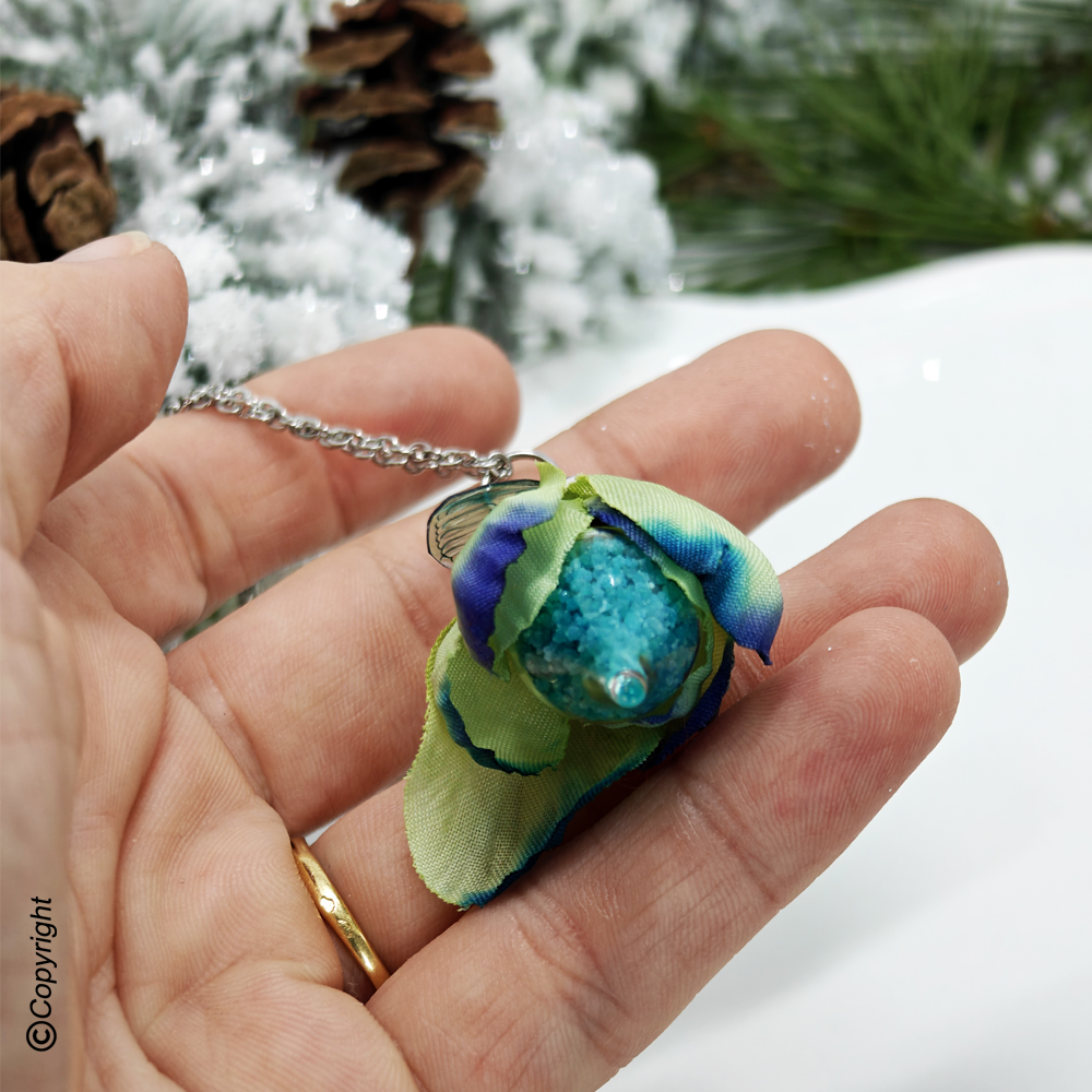 Cette création est ornée d'une aile de Fée flexible, d'une fiole en verre contenant de la poudre phosphorescente recouverte de pétale de fleurs en tissu.