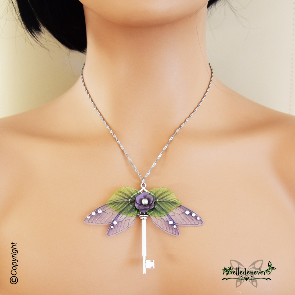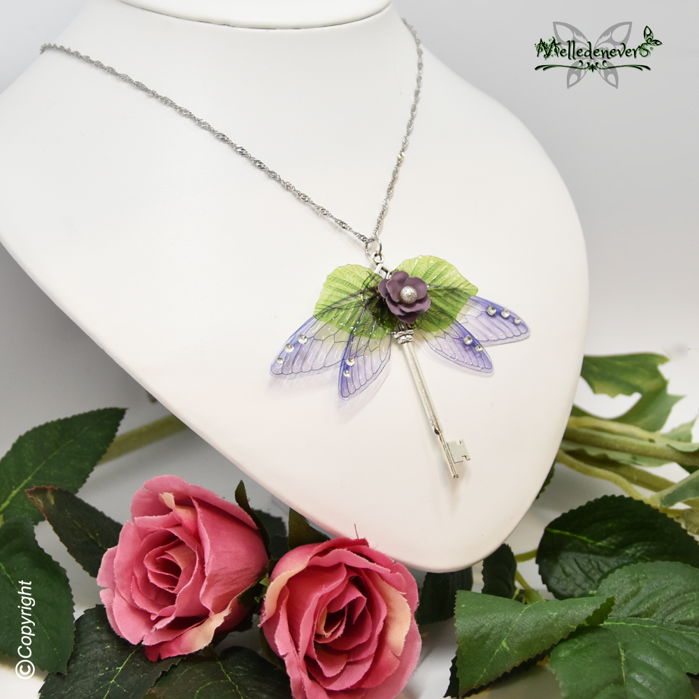 Fée de L’Eté est un collier artisanal réalisé dans mon atelier par mes soins. La chaîne est en acier chirurgical inoxydable et hypoallergénique. Le pendentif est orné d'une clé magique qui ouvre un portail féerique ornée de 4 ailes de fées transparentes mauve lila et de deux feuilles déployées. Les ailes sont parsemées de cristal étincelants et la fleur éclose ouverte est en métal.