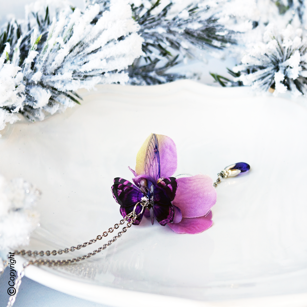 Cette création est ornée d'une aile de fée et d'un papillon flexibles, d'une fiole en verre contenant de la poudre phosphorescente recouverte de pétales de fleurs en tissu.
