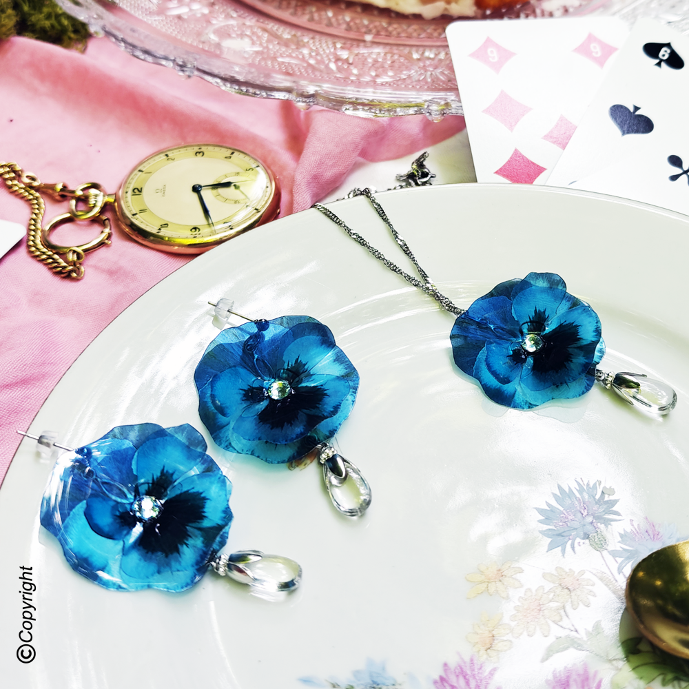 Cette création est ornée d'une fleur de Pensée avec un cristal en son centre.